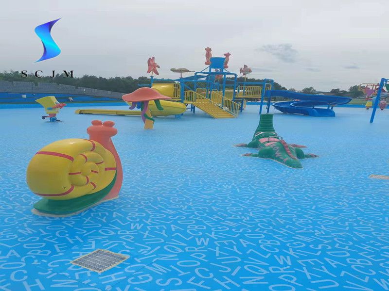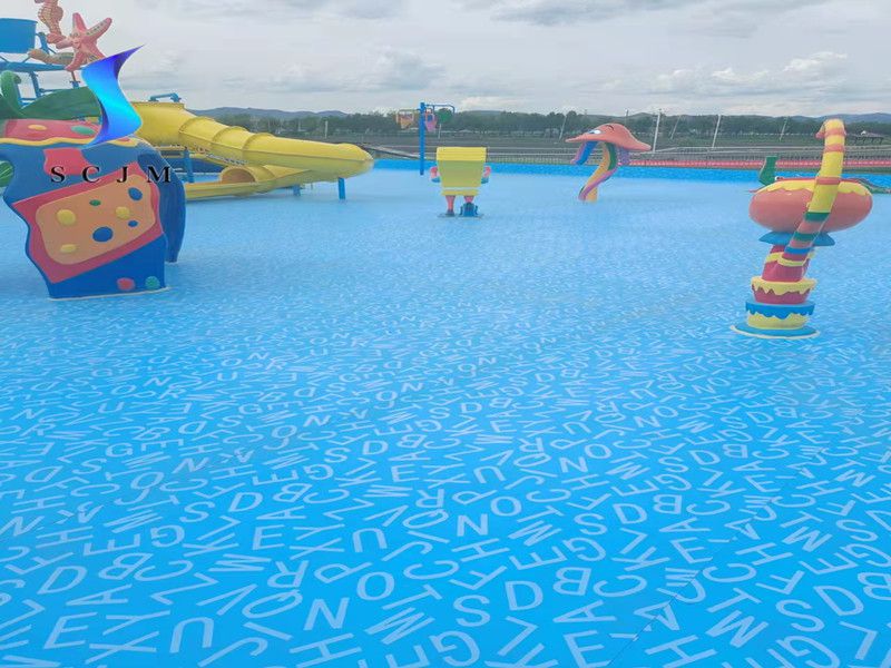 本項(xiàng)目位于內(nèi)蒙古自治區(qū),為室外戲水池項(xiàng)目,也就是水上樂(lè)園項(xiàng)目,基礎(chǔ)面為水泥收光面,采用滿(mǎn)刮膠搭邊熱熔焊接工藝,選擇1.5mm字母圖案游泳池防水膠膜為材料,進(jìn)行鋪設(shè)安裝,整體效果如下: