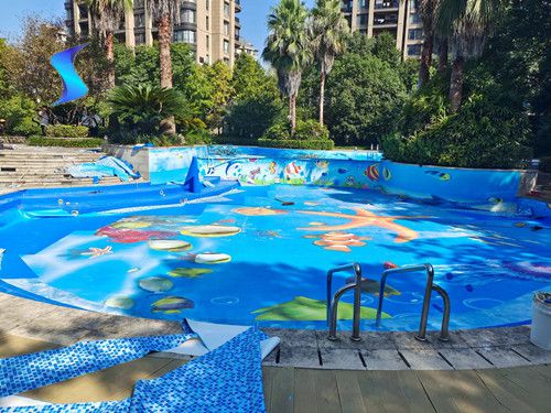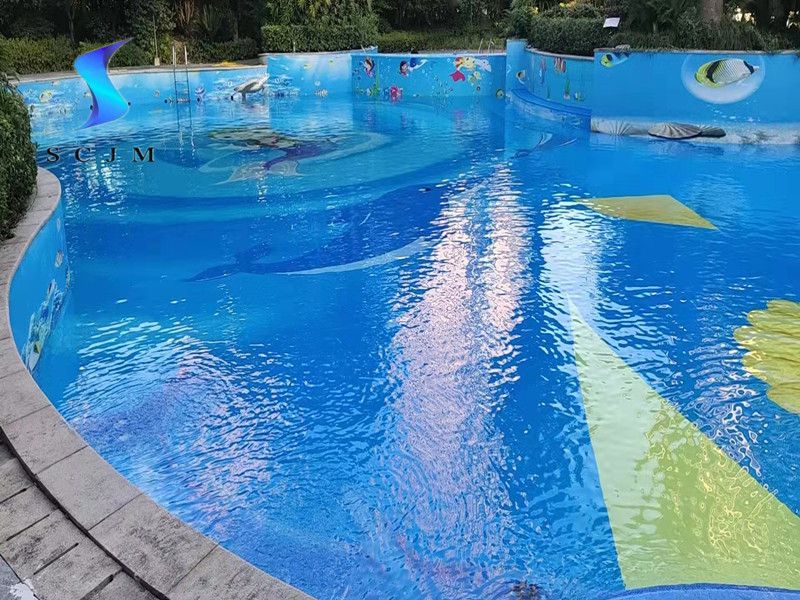 浙江省室外小區(qū)游泳池改造防水膠膜定制圖案案例